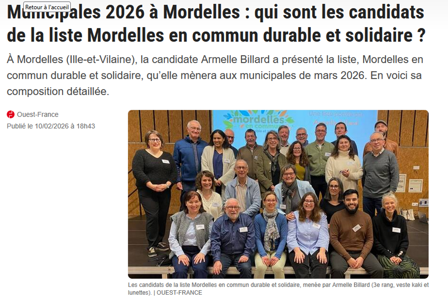 Municipales 2026 à Mordelles : qui sont les candidats de la liste Mordelles en commun durable et solidaire ? Article Ouest France du 10 février 2026 Lien vers le site Ouest France